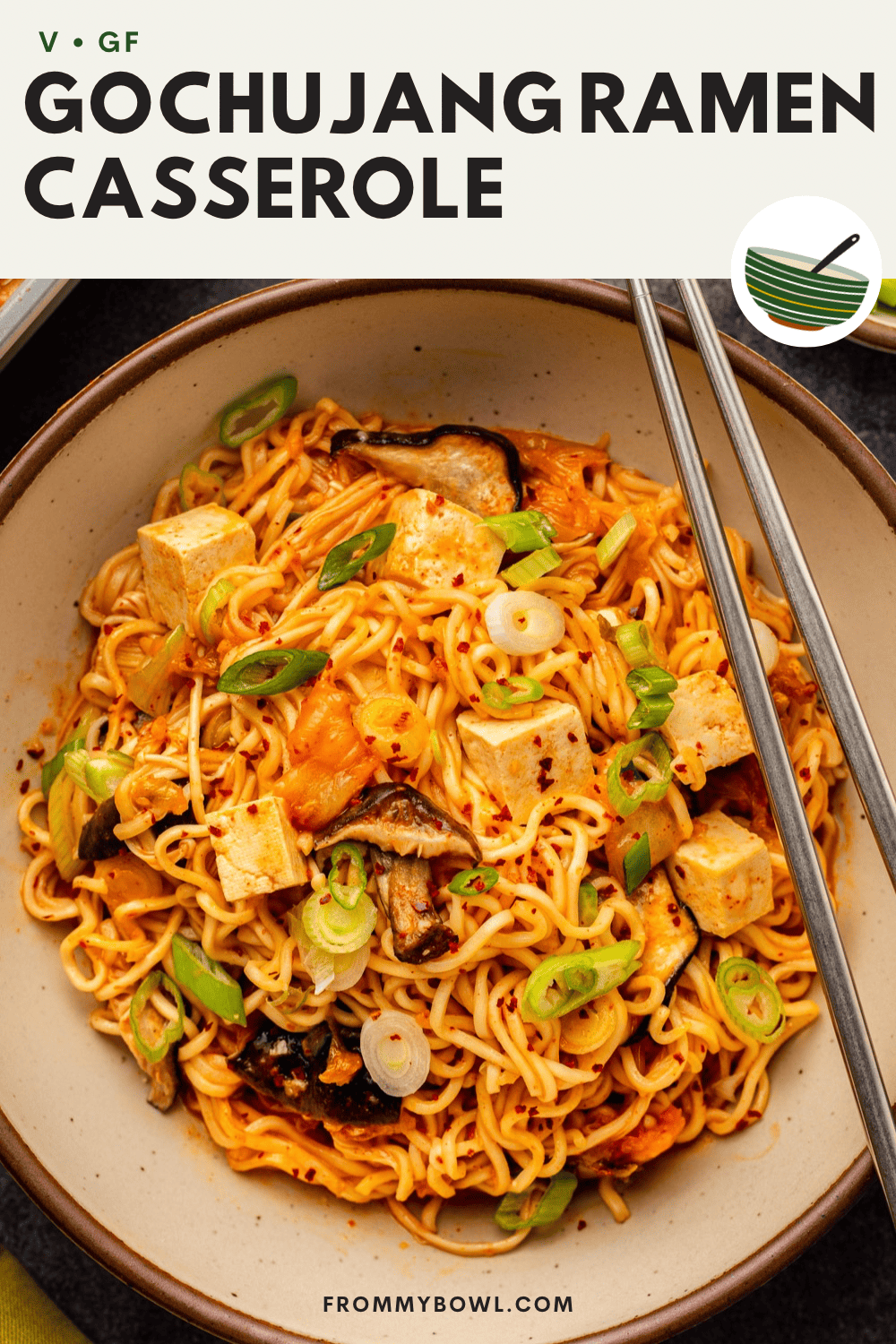This Gochujang Ramen Casserole layers ramen noodles, tofu, and mushrooms in a casserole dish with a custom broth made from gochujang (고추장), miso paste, garlic, and gochugaru. While it’s baking, the ingredients soak up that spicy, umami-packed broth to leave you with a seriously delicious and foolproof ramen-inspired dinner.