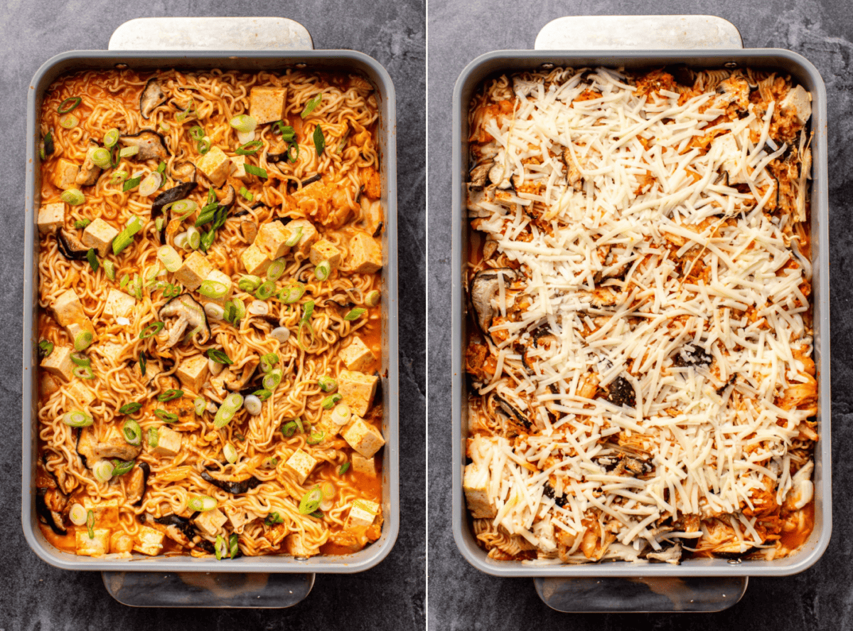 - Layer: Add the dried ramen noodles to the base of the casserole dish and sprinkle the tofu on top. Add the mushrooms, and kimchi and use tongs to spread them around evenly as well. Pour the broth over the noodles. Sprinkle the top of the casserole with cheese, if desired.