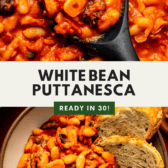This one-pot White Bean Puttanesca packs a punch, with white beans simmered in a rich sauce made from tomatoes, olives, capers, and garlic. A fun and easy play on an Italian classic! Vegan and Gluten-Free.