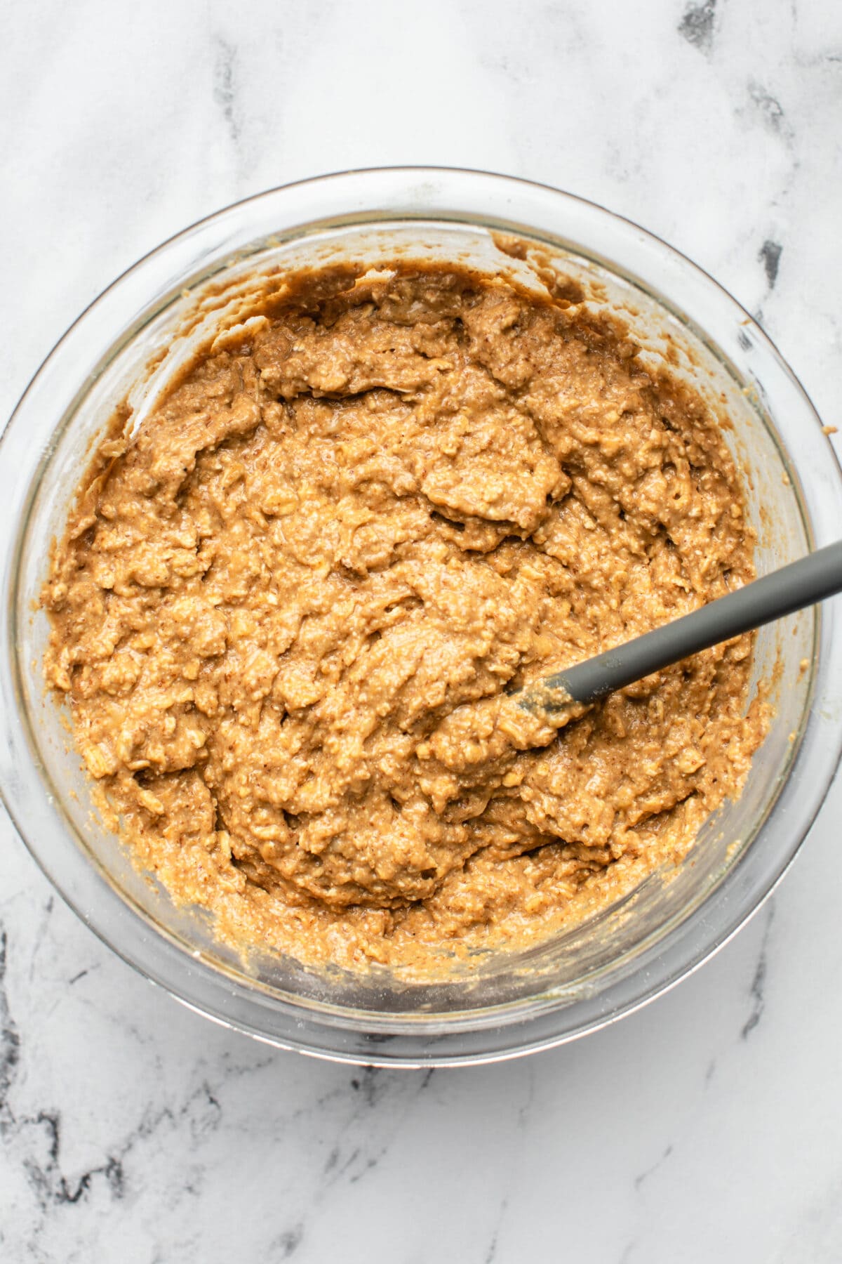 - Mash the bananas in a separate large bowl until even and runny in texture. Add the nut butter, sugar, apple cider vinegar, vanilla, and flax egg. Mix to combine.